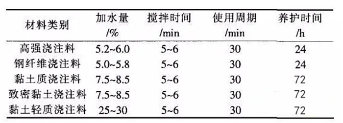 (7)攪拌好的澆注料不得二次加水使用,并應(yīng)在30min內(nèi)用完,剩余的混凝土(澆注料)須丟棄。澆注料養(yǎng)護(hù)按照表1執(zhí)行,驗收合格后方可拆模。