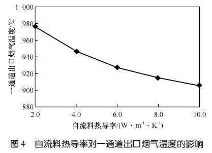 SiC 自流料熱導(dǎo)率對一通道出口煙氣溫度的影響圖4示出了自流料熱導(dǎo)率對一通道出口煙氣溫度的影響?梢钥闯觯瑺t襯各工作層厚度固定時(shí),一通道出口煙氣溫度隨自流料熱導(dǎo)率的升高而降低。通過調(diào)整自流料熱導(dǎo)率,一通道出口煙氣溫度差值高達(dá) 70 ℃。