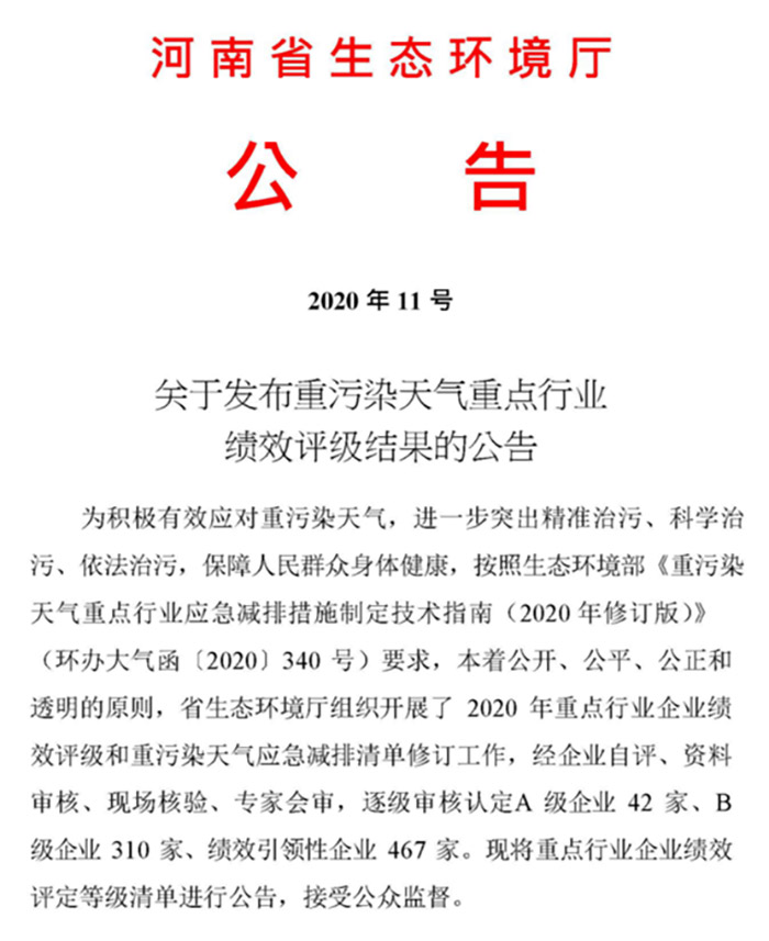 此次績效評級,是按照國家生態(tài)環(huán)境部《重污染天氣重點行業(yè)應急減排措施制定技術指南(2020年修訂版)》(環(huán)辦大氣函〔2020〕340號)有關要求,對重點行業(yè)開展的環(huán)?冃гu級,經(jīng)企業(yè)自評、資料審核、現(xiàn)場核驗、專家會審,經(jīng)河南省生態(tài)環(huán)境廳經(jīng)審核認定,鄭州榮盛窯爐耐火材料有限公司被評為績效引領性企業(yè)。