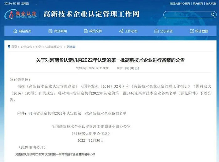 發(fā)布時間:2023/2/2 16:55:21 點擊率: 來源:高鋁磚廠家 作者:榮盛耐材近日,高新技術(shù)企業(yè)認定管理工作領(lǐng)導小組辦公室發(fā)布了《關(guān)于對河南省認定機構(gòu)2022年認定的一批高新技術(shù)企業(yè)進行備案的公告》。由多個部門審核推薦,經(jīng)專家評審,鄭州榮盛窯爐耐火材料有限公司通過2022年度“國家高新技術(shù)企業(yè)”復(fù)審。此次是2019年公司初次獲得國家高新技術(shù)企業(yè)以來,再次被復(fù)審認定為國家高新技術(shù)企業(yè)。