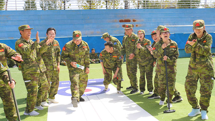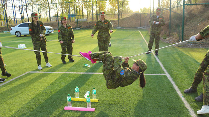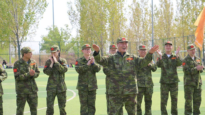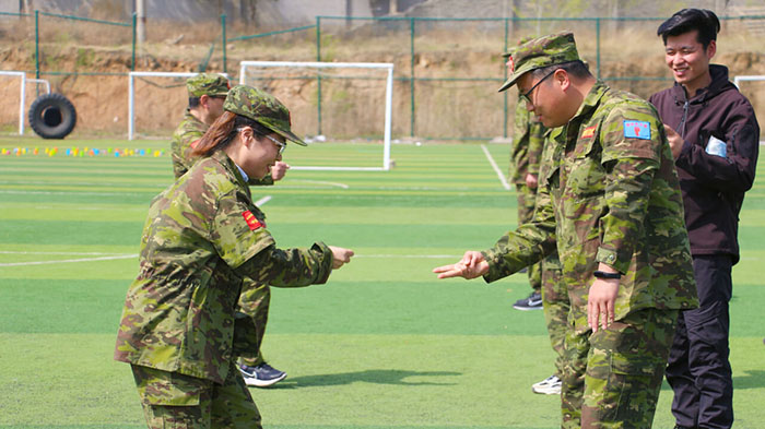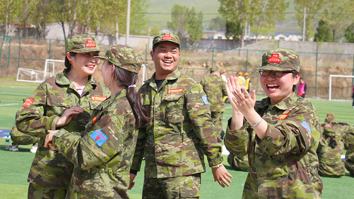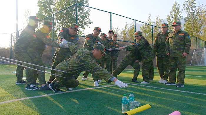 開訓(xùn)前,在破冰啟航環(huán)節(jié)——【智勇通關(guān)】項目中,每組選一個大魔王來防守別隊,該隊隊員依次挑戰(zhàn)大魔王,石頭剪刀布定輸贏,贏了直接通過,輸了轉(zhuǎn)一圈,回來接著挑戰(zhàn),再輸即增加圈數(shù),直到全部隊員通過。大家把團(tuán)隊當(dāng)成了自己的“城堡”,在“對抗魔王”中,每個隊員都拼盡全力,期待被幸運(yùn)女神光顧,期待團(tuán)隊能盡早完成任務(wù),大家的歡笑聲、喝彩聲灑滿了訓(xùn)練場。