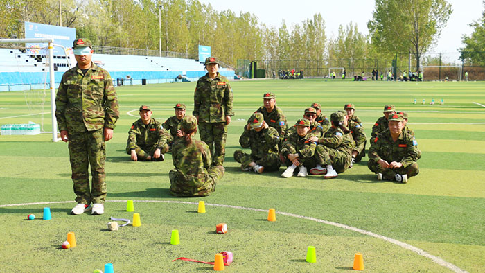 在【沙場點兵】項目,要求每個隊選出一個總指揮做將軍,一個協(xié)調(diào)者做軍師,剩余伙伴作為士兵。設(shè)定將軍起著總指揮的作用,但無法看見戰(zhàn)場的具體情況,其命令需由軍師來傳達(dá)。而軍師則只能用肢體語言告訴將軍該如何部署,士兵們則需要蒙著眼睛聽將軍命令,從而實現(xiàn)在沙場前進(jìn)、攻擊。當(dāng)規(guī)則定好,每個人所要做的就是各司其職。有人規(guī)劃部署,有人上傳下達(dá),有人依命令行事,雖然有理解錯誤、聽錯命令的情況發(fā)生,大家還是玩得不亦樂乎。在這個項目中,大家感悟到正確溝通的重要性。