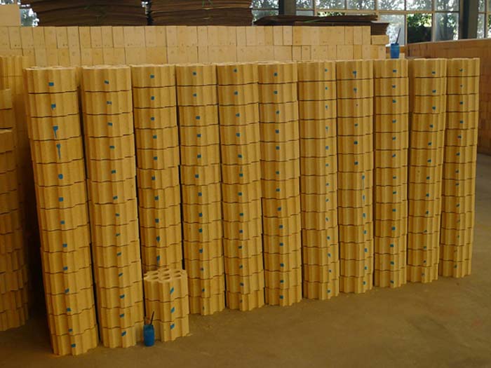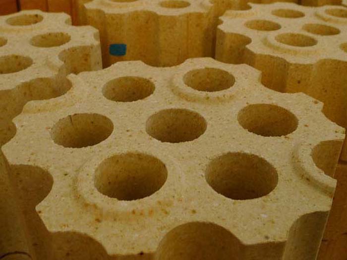 格子磚主要用在熱風(fēng)爐上,當(dāng)熱風(fēng)低于900℃時,一般選用粘土磚;當(dāng)風(fēng)溫高于900℃時,格子磚則采用高鋁磚、莫來石磚、硅線石磚和硅磚等。